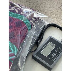 Vintage-style sweater with geometric patterns in bold purple, teal, and white hues. Lightweight cotton blend, roomy fit, and crewneck.