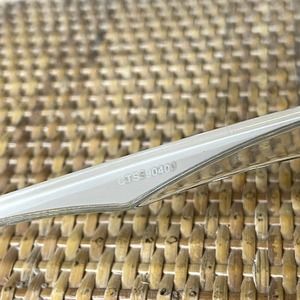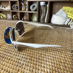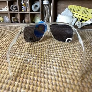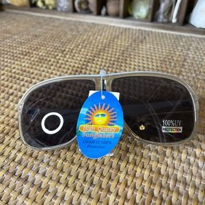 90s sunglasses with clear and white plastic frames and smoky gray aviator style lenses (I believe plastic). UV protection. Deadstock with tags. Some general wear from being moved around.