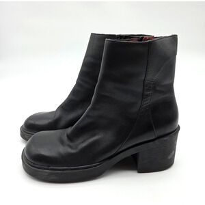 Vintage 90s Cloud 9 Nine West black leather platform chunky block heel ankle boots. If you were in high school in 1998, you were definitely saving up your babysitting money for these! Size has worn off, they fit like a 8.5 or 9. 2.5" heel over about a 1" platform. They are gently pre-owned and free from any stains or flaws. May show light wear or scuffs from normal use. They have some sticker residue that should come off with some goo gone.