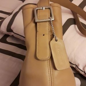 Vintage 90's Coach Bucket Tote Bag in Tan Leather with Silver buckles. Beautiful Bag In great condition for its age. Clean inside and out. No wear or scratches. Only very-slight pen mark on front and Mark's on strap under buckles. See photos for all details.