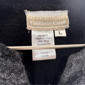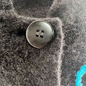 Coldwater Creek black 100% wool cardigan sweater with embroidered neon swirls, button front, long sleeves, crew neck, bottom side splits. Very good pre-owned condition.