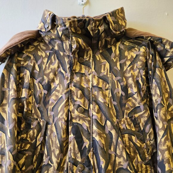Tags/keywords: Columbia jacket, vintage jacket, camouflage coat, outdoor clothing, hunting jacket, men's outerwear, winter coat, retro style, polyester jacket, patterned jacket, rugged jacket, brown and beige, hooded jacket, waterproof, duck hunting, wetland, 90s, streetwear, gorpcore, retro