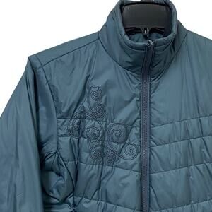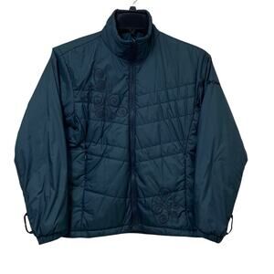 Gray jacket has zip closure. Two outside zip up pockets. Two large inside mesh pockets. Shell is 100% polyester. Lining is 100% nylon. Machine washable.