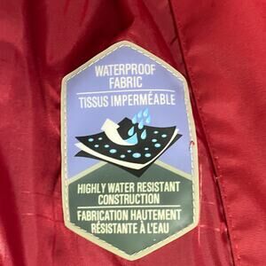 Red jacket has a zip closure. Two outside zip up pockets. A removable hood. Waterproof fabric. Shell and lining 100% nylon. Machine washable.