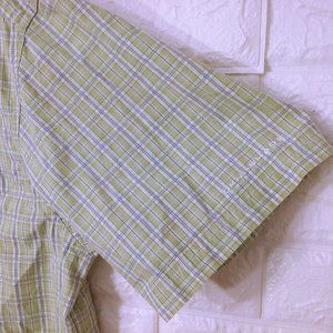 Vintage 90s Button-front Shirt | Columbia Sportswear Company made in Sri Lanka, Men's Sz-XL, PFG Omni-Shade, logo tab, cooling mesh back vented, Relaxed Fit, plaid Striped checked, Button-up, Collar, Pockets w/hook n'loop closure, short Sleeves, easy care washable soft, gently worn-in mid-weight 60% cotton 40% polyester shell with poly Mesh back inset, in shades of pastel lime green. In pre-owned* condition with no visible flaws - little wrinkled - see pics. Grandpa Dad Favorite Career Casual Street Country Western Ranch Rodeo Backcountry Homestead Camping Fishing Hunting Fireplace Mountain Cabin Chore Hobby