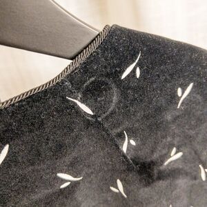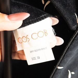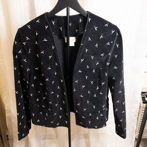 Chic vintage Cos Cob black velveteen blazer featuring a subtle white abstract sprig print and a sleek open-front design. A timeless statement piece that blends retro sophistication with minimalist charm.