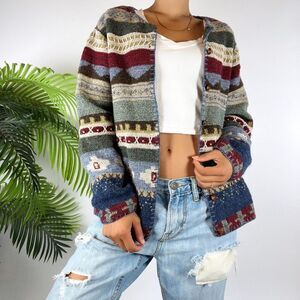 Features earthy colors, button closure, long sleeves, and round neck. Omg! This vintage piece is a one of a kind find! It is so thick and cozy. The fabrics are excellent quality! The colors look so good on everyone and it's fun to style in different aesthetics!