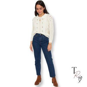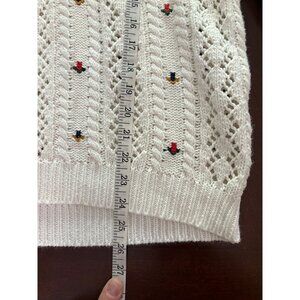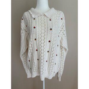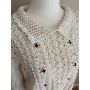This rare Liz Sport piece blends timeless cable-knit texture with charming embroidered florals and a feminine collar—perfect with jeans, skirts, or layered over dresses for cozy, nostalgic style.