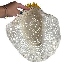 Vintage 90s Cream Crochet Straw Floppy Wide Brim Hat w/ Sunflower