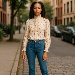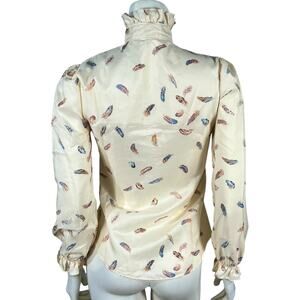 Vintage 90s Cream Feather Print Ruffle Victorian Style Blouse Size Small