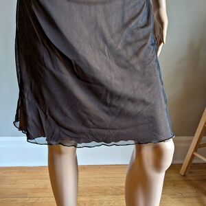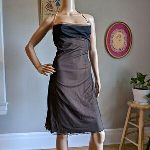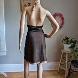 Vintage 1990s Crew mini dress. Black mesh with nude/tan lining. Lettuce hem. Halter top, cowl neck. Dress is in good condition with some small snags to mesh overlay. Please see photos for an idea of this wear.