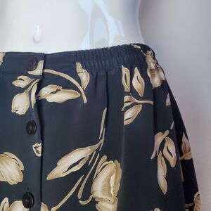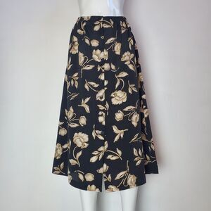 Vintage 90s Cricket Lane black, brown, and cream floral button-front midi skirt. High-waisted with partially elastic waistband and buttons down the front. No pockets.