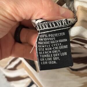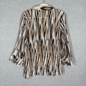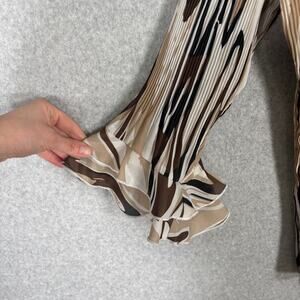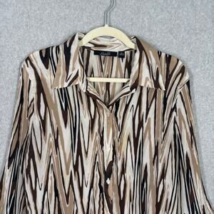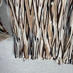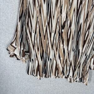 VTG 90s Essentials Blouse XL Brown Ruffle Crinkle Artsy Abstract Neutrals Siren Button Shirt Pleated V Neck Chiffon Long Sleeve Geometric Mob Wife Corp Career Work Office Business Church Classic Casual Brown White Cream Beige Tan Maximalism