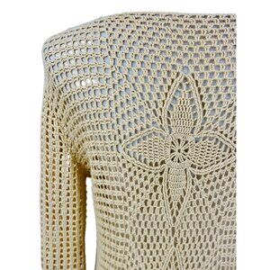Embrace the timeless fashion styles of the 90s with this beachy vintage boho-chic crochet cardigan. Featuring intricate floral patterns, bell sleeves, and a tie closure, this piece effortlessly adds a touch of vintage inspired charm to any outfit.