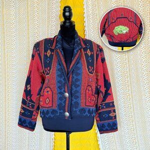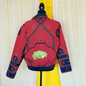 Vintage 90s Cropped Tapestry Aztec Jacket w/ Frog Prince Applique Size OS