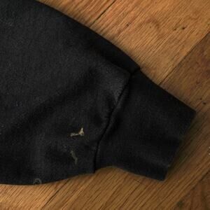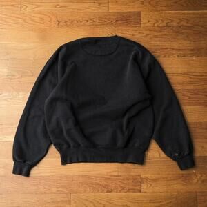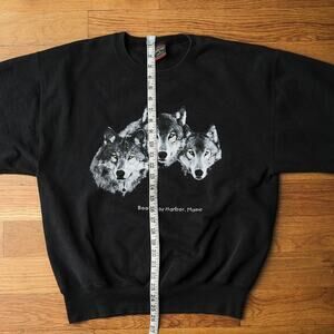 Vintage 90s black crewneck sweatshirt featuring a bold Wolf Graphic and Boothbay Harbor, Maine text across the chest. Made in the USA from a heavyweight 80/20 cotton-poly blend, pullover style with soft interior and ribbed cuffs and hem.