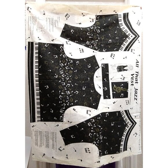 Uncut: This is a cut and sew (pre laid out) craft panel / pattern for a music themed vest: simply cut, sew, and fill! This pattern is All That Jazz Vest by Fabric Traditions, a black and white with gold sparkle vest, with a white and gold music note pattern, and a piano pattern along the lower edge. Marked for sizes S, M, and L, instructions printed on fabric. Vintage, from the 1990s. Rare! Cotton broadcloth, about 36" x 43".