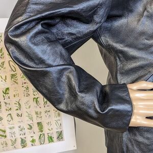 Embrace the essence of vintage fashion with this DV Design black leather jacket. This classic junior's jacket features a button-front closure and is made with high-quality leather. The outer shell of the jacket is completely made of leather, making it a durable and long-lasting piece. The jacket is perfect for any 90s-themed event or simply to add a touch of retro style to any outfit. The jacket comes in a beautiful black color that complements any wardrobe. Add a touch of elegance and sophistication with this timeless piece!