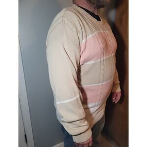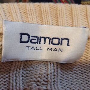 Step back in time with this awesome vintage Damon grandpa sweater from the 1990s! This 2XLT (Extra Large Tall) sweater is made from 100% combed cotton, ensuring a soft, comfy, and substantial feel. The pastel stripes in tan, peach, and white, along with the all-over cable knit braiding, give it a classic Cosby sweater vibe.