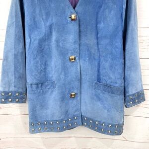 Vintage 90’s Danier Canada Blue Suede Leather Studded Blazer Jacket. Gold tone square buttons and stud trim. Minor discoloration on a few buttons. In great condition. Oversized vintage Small and fits more like a Medium. See flat measurements below.
