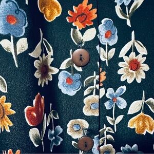 Gorgeous vintage 90s forest green floral maxi skirt with brown button front accents and a stretchy elastic waist. Fairycore, modest, romantic, retro, cottagecore, classic.