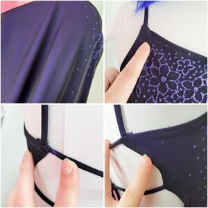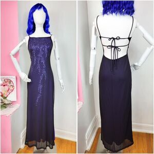 Vintage late 90s deep purple, strappy open back gown by Candy Rocket features a glitter floral design on the front, black mesh overlay, side slit and two back ties. Please note, there are a few small imperfections. Some of the stitching is uneven across the chest/back. Small hole in the black mesh on one of the straps and few small thread pulls here and there. Dress is tagged size L, but would recommend for size S/M for a more comfortable fit. Mannequin measures B 34 / W 25 / H 35. Please see measurements for details. PM me if you have any questions.