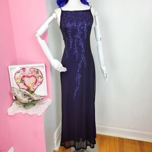 Vintage 90s Dark Purple Glitter Floral Open Back Maxi Dress / Gown