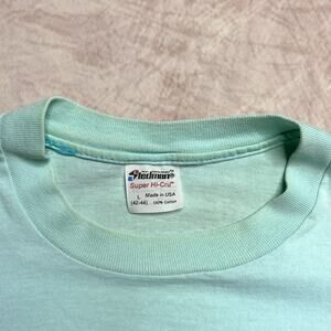 Condition- fair condition, flaws include some discoloration around neckline and on the back, a few small stains next to the graphic, small pinhole on the back and small patched hole on the front. See photos & message with any questions.