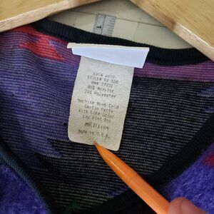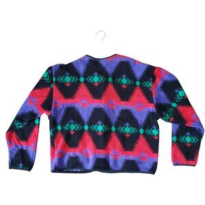 This vintage 1990s cardigan from David Wayne showcases a bold Navajo-inspired Aztec print in vivid red, black, green, and purple tones. Made in the USA, this sweater offers a nostalgic touch with its vibrant geometric patterns and cozy design, ideal as a standout piece for colder seasons.