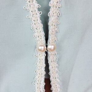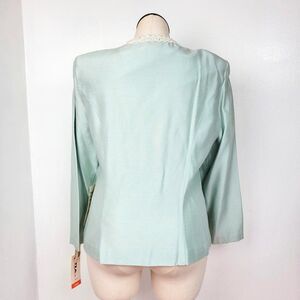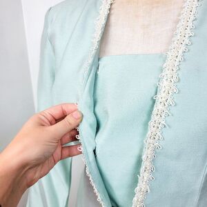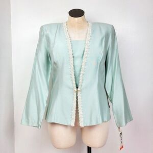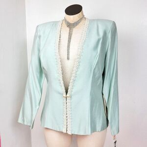 Vintage 90s deadstock icy blue blazer by Patra. Has a corded lace trim neckline, removable modesty panel and pear accents. Has a hook and eye closure. Please note there are a few yellow age spots along the trim. Tagged size 17/18. Best fit size 1X. Mannequin measures B 40 / W 32 / H 43 (size L). Please see measurements for details. PM me if you have any questions.