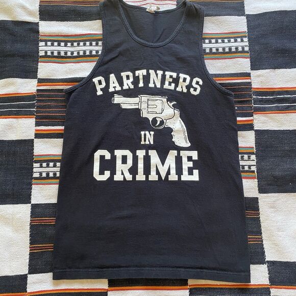 Amazing 90s Delta Graphic Unisex Tank tee. Has White Graphic on front that says Partners in crime with a 38. Shirt is in excellent shape with no spots, stains, snags, holes or fade. No cracks in graphic.
