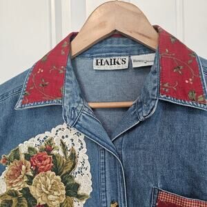 Vintage 90s Denim Blouse Womens Small Red Patchwork Cottagecore Lace Flowers