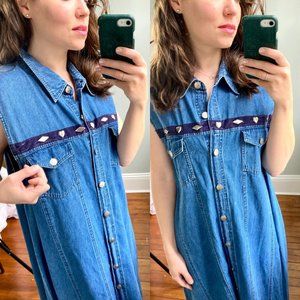 Vintage 90s Denim Button Down Silver Velvet Sleeveless Slit Maxi Dress L