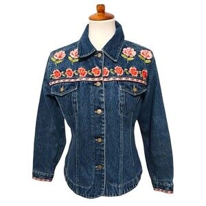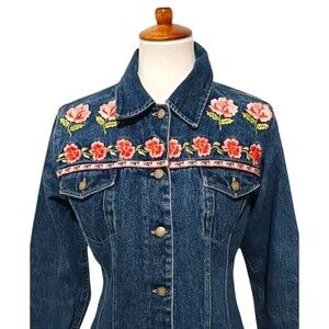 Vintage 90's Denim Jean Jacket Bill Blass Women's Small Floral Embroidered Y2K