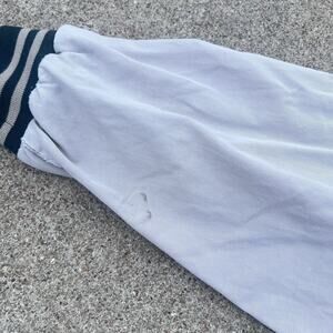 Has various paint stains and has wear to sleeves. Worn in and distressed. Please see photos of flaws.