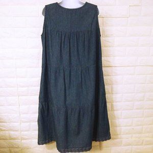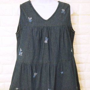 -- LA CERA made in India, Popover, tiered ruffled, V-neck, Pockets, sleeveless, Ladies Medium (8/10), Embroidered Floral flowers pattern, eyelet lace hemline trim, mid-weight easy care 100% cotton fabric in neutral shades of dark wash indigo navy light blues.