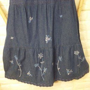 Vintage 90s Denim Jumper Pinafore Dress -M Embroidered Floral Pockets Lace Trim