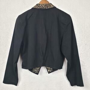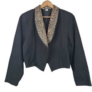 Vintage 90s Denim Open Front Blazer - L in excellent condition. Like new. Black, brown, tan animal cheetah print. No brand, this is likely a small boutique piece from the early 90s.
