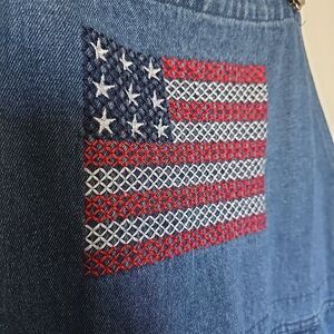 Vintage 90s Denim Overalls Capris American Flag Med Blue Jean USA Embroidered
