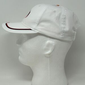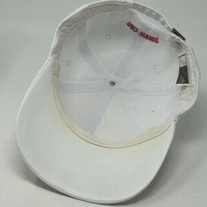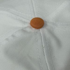 Has some faint staining on the bill and sweatband, has a little flaw on the tip of the underside of the bill, and top button has faded - no other flaws noticed. Has been cleaned and sanitized. See photos.