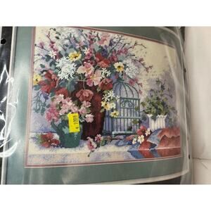 Vintage 90s Dimensions #2382 Needlepoint Pillow Birdcage Floral Flowers 18x14