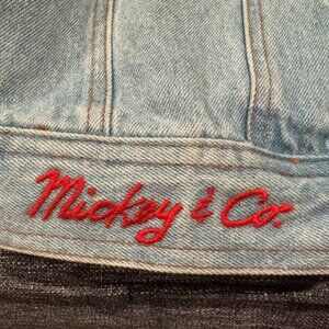 Rare vintage 1990s Disney denim trucker jacket featuring an embroidered Mickey Mouse graphic on the back. Appears unworn and is in exceptional, nearly-new condition