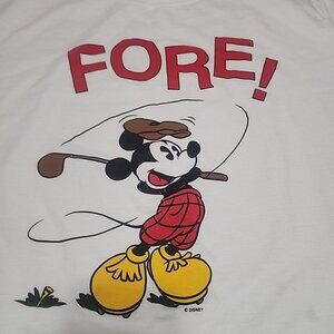 Features: This classic vintage t-shirt features a vibrant graphic of Mickey Mouse dressed in golf attire, mid-swing, with the word "FORE!" in bold red letters above. The design is a licensed Disney product, perfect for any Disney fan, golf enthusiast, or collector of vintage apparel. The shirt appears to be a single-stitch construction, which is a common characteristic of vintage tees.