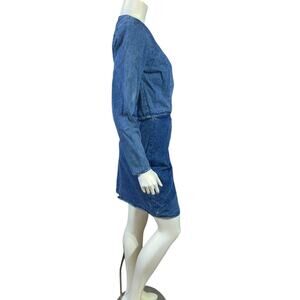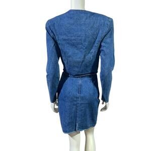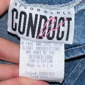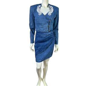 Stunning vintage 1990s two-piece denim set by Disorderly Conduct. This eye-catching ensemble features a cropped jacket with distinctive white lace collar detailing and an asymmetrical button closure, paired with a coordinating mini skirt with gathered side detail and asymmetrical wrap-style design.