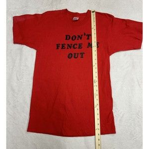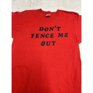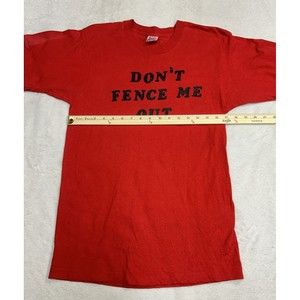 Vintage 90s "Dont Fence Me Out" Red Graphic T-Shirt Single Stitch Size Medium. Cracking and peeling throughout the graphic. Please see pictures for condition and measurements for proper sizing and fit.