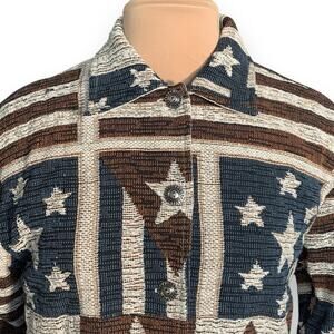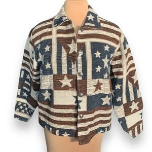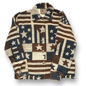 Woven cotton button-up jacket with allover rustic USA flag patchwork