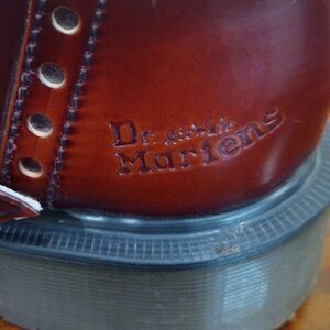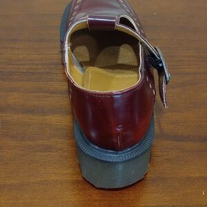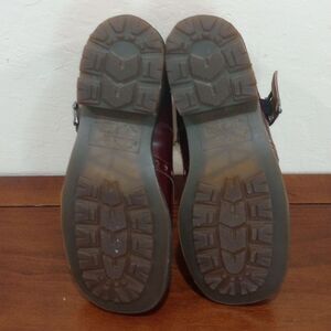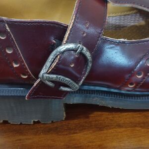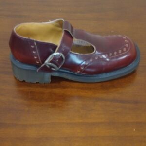 90’s vintage Dr. Martens T Strap Mary Jane shoes; Factory distressed tarnished buckle; Perforated leather trim; Deep burgundy color; with air cushion soles. In excellent vintage condition with very minor signs of wear~ Buckles are tarnished. Made in England. Women’s size UK 5/US 7.