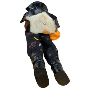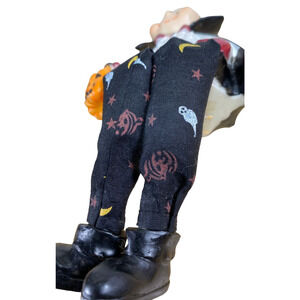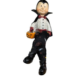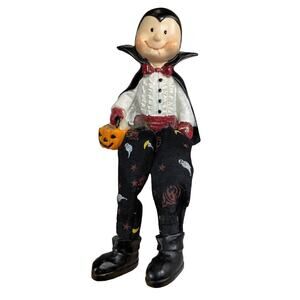 Vintage Dracula Vampire Halloween Home Decor Shelf Sitter 7”. Cute sitting next to a lighted up pumpkin or scented candle. Shelf sitter with weighted bottom and feet. Fun cute Halloween Vampire with spooky pants. Has little pumpkin bucket ready for Trick-Or-Treat. Good for gift Halloween giving or just to add to your own collection.
