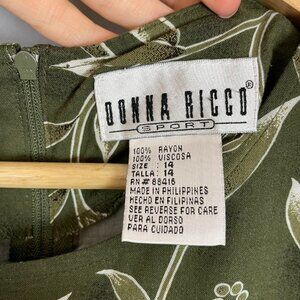 Vintage 90s Donna Rico Sport women's sleeveless midi dress in green with a leafy pattern all over. Tie at back waist.