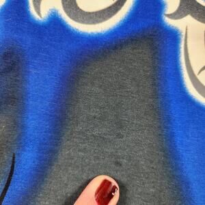 SHIRT HAS A BEAUTIFUL BLUE AND BLACK COLORWAY WITH A SPIKY TRIBAL DESIGN. THEY WOULD LOOK GREAT WITH BAGGY JEANS AND CHUNKY BOOTS. THERE ARE TWO SMALL STAINS. THEY CAN BE SEEN IN THE PHOTOS ABOVE.